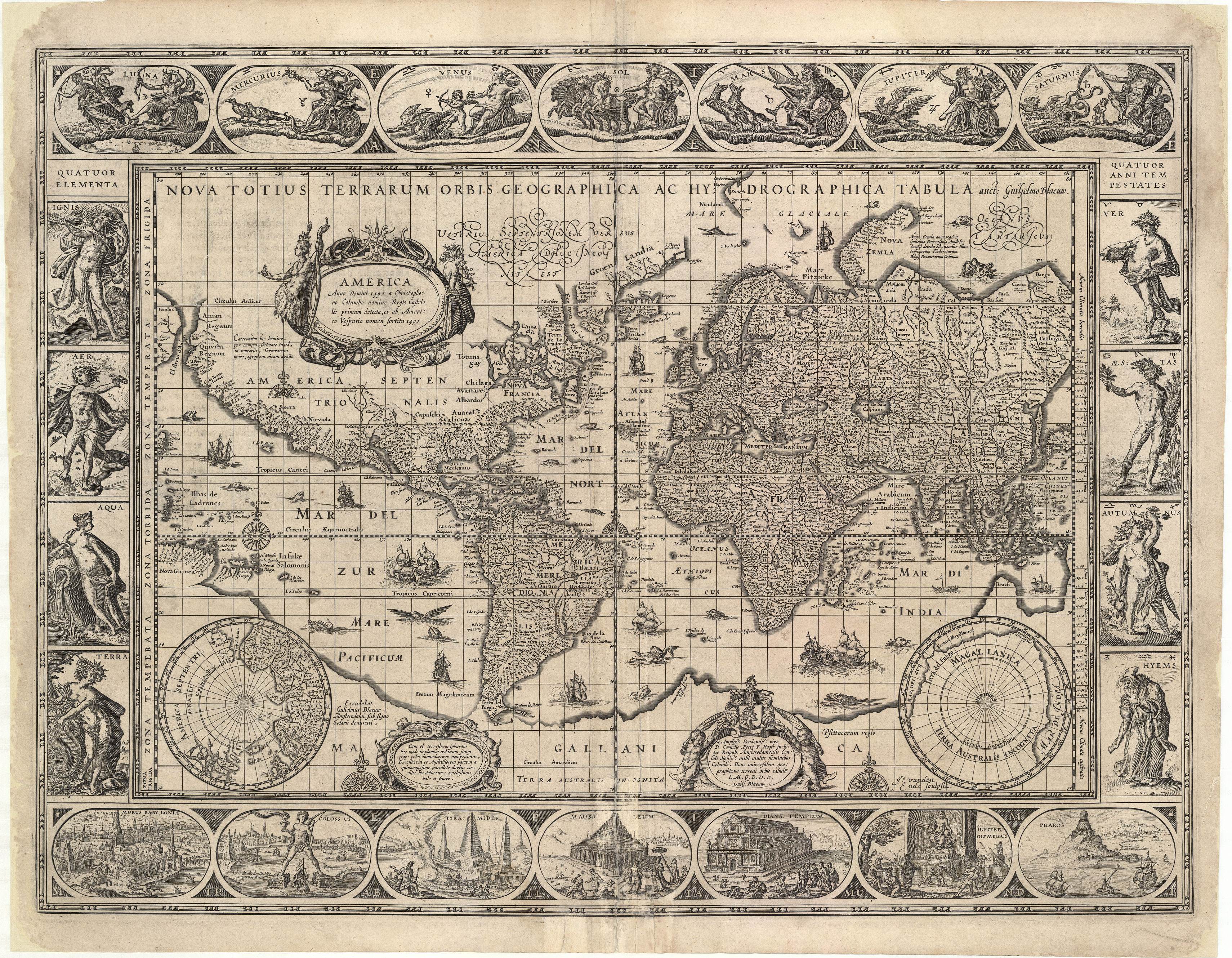 De beroemde Amsterdamse kaartenmaker Willem Jansz Blaeu, drukte deze wereldkaart vanaf 1630 voor verschillende edities van zijn Atlas. De kaart laat goed het wereldbeeld uit de zeventiende eeuw zien. Europa is afgebeeld als het centrum van de wereld.