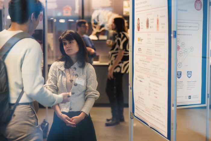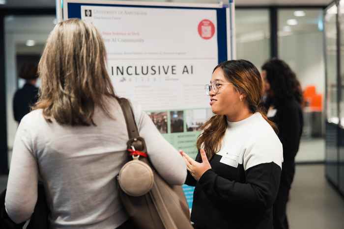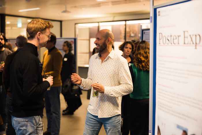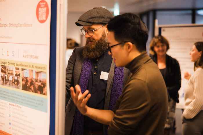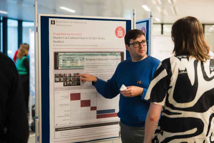 Posters were presented by the Artificial Intelligence Student Organisation (AISO), ELLIS, ICAI, bioDSC, SoBe DSC, the Amsterdam People Analytics Centre, the UvA Strategic Themes, TTT-AI, the Anton Pannekoek Institute for Astronomy, qurAI Lab, Amsterdam AI, ChemAI, Inclusive AI, Institute for Advanced Study, the MBA in AI, the Data & Analytics programme, the Masters Programme Artificial Intelligence, and Masters Programme Cultural Data and AI, Lab42, the University Library Publishing Team, the Critical Infrastructure Lab, the DSC's HAVA Lab, and the Amsterdam Policy Hackathon category winner.